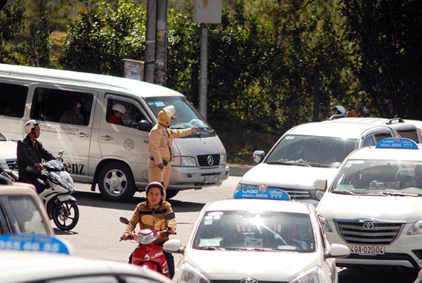 Lực lượng cảnh sát giao thông phải làm việc khá vất vả để phân luồng, hướng dẫn giao thông. Trong khi đó, tại các khu du lịch như Vườn hoa thành phố, Thung Lũng Tình Yêu, Đồi mộng mơ, XQ Sử quán, thác Datanla, Prenn… càng về trưa dòng du khách đổ về càng đông.