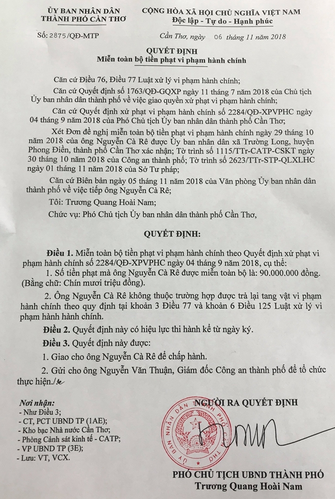 Ông Trương Quang Hoài Nam, Phó Chủ tịch UBND TP Cần Thơ vừa ký quyết định số 2875/QĐ-MTP, miễn toàn bộ tiền phạt vi phạm hành chính cho ông Nguyễn Cà Rê (thợ điện, 38 tuổi, ngụ quận Ninh Kiều), theo quyết định xử phạt vi phạm hành chính số 2284/QĐ-XPVPHC ngày 4-9 vừa qua.