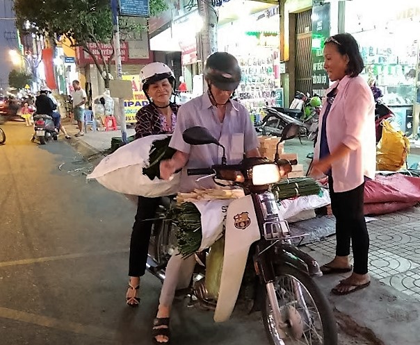 | Ông bà cụ tự lái xe đi mua lá về gói bánh |