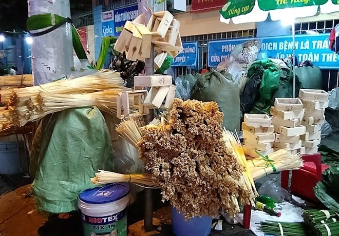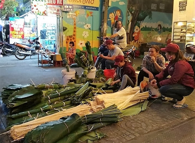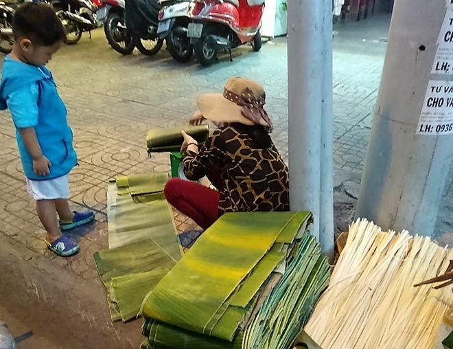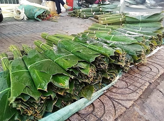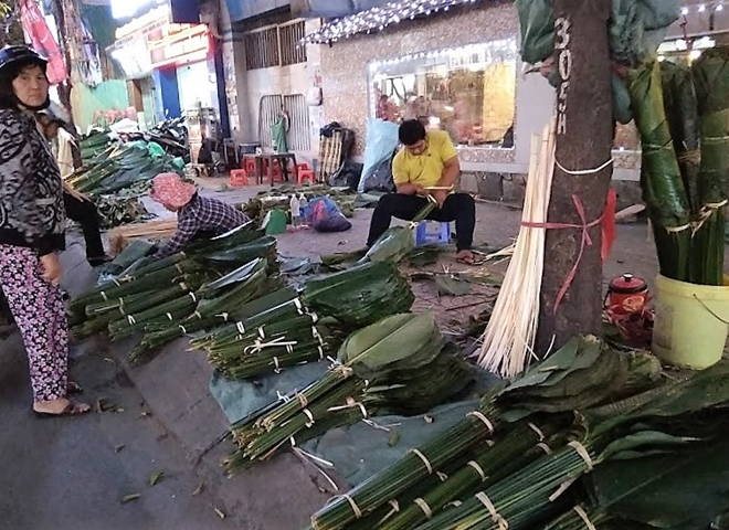 | Bắt đầu từ 20 tháng chạp chợ lá dong trên đường Cách Mạng Tháng Tám lại được mở bán phục vụ những người gói bánh tại nhà, giữ nét truyền thống xưa |