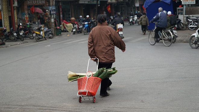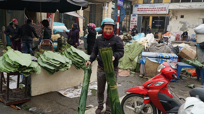 | Một bà nội trợ trở về từ khu chợ với những bó lá dong và lạt chuẩn bị cho nồi bánh chưng Tết. Khu chợ đặc biệt này điểm thêm một nét độc đáo cho bức tranh về cuộc sống của người dân Thủ đô dịp cận Tết Nguyên Đán. |