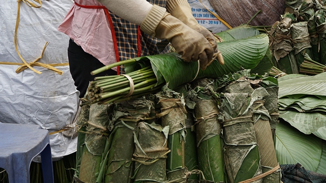 | Lá dong được tiểu thương vận chuyển về đây sau đó sẽ lại được chọn thật kỹ càng rồi mới bán cho khách. |
