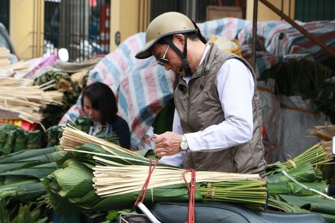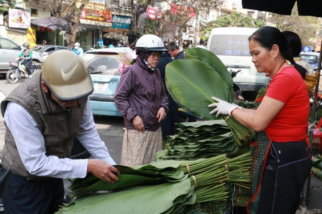 | Những ngày giáp Tết Nguyên đán, nhiều người dân Hà Nội lại đổ về chợ lá dong trên đường Trần Quý Cáp để chọn mua được những bó lá dong hợp ý về gói bánh chưng. |