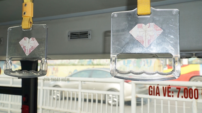 | Tại tay nắm trên xe buýt thay cho những tờ quảng cáo đơn điệu là một hình trái tim được gấp bằng tờ tiền giấy mệnh giá 500 đồng. |