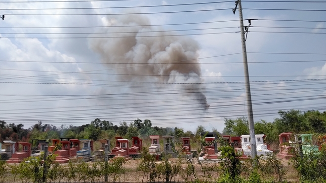 Theo người dân chứng kiến tại hiện trường vụ cháy kể lại, vào khoảng 12h10 ngày 7-4, nhiều người dân sống ở khu vực hoảng vía khi nhìn thấy khói cuồn cuộn bốc lên từ bên trong, phía sau công viên nghĩa trang Vạn Phước Viên ở ấp Tân Quới, xã Tân Lý Đông, huyện Châu Thành, tiếp đó ngọn lửa bùng cháy thiêu rụi cỏ sậy và nhiều cây cối mọc um tùm nơi này.
