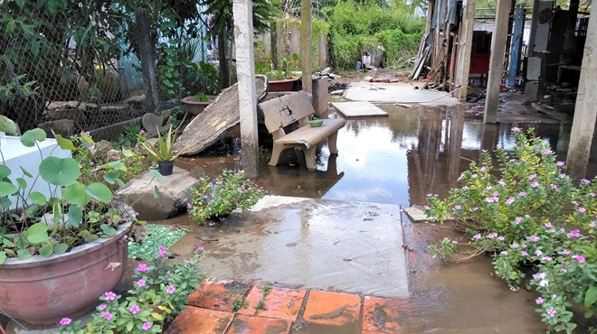 | Nguồn nước từ cột nước này tràn ra ngoài gây ngập nước trong sân nhà một hộ dân. |