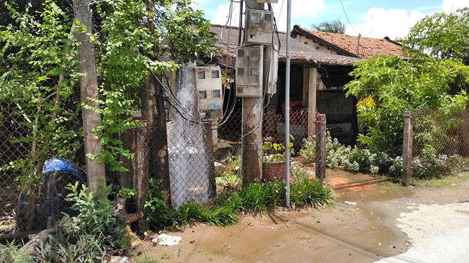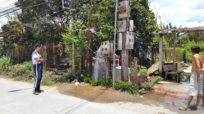 | Hiện trường cột nước phun vào hệ thống điện dẫn vào nhà nhiều hộ dân ở ấp Thân Bình, xã Thân Cửu Nghĩa, huyện Châu Thành. |