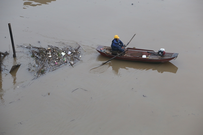 | Công nhân vệ sinh được huy động liên tục những ngày qua để làm sạch mặt nước sông Hồng |