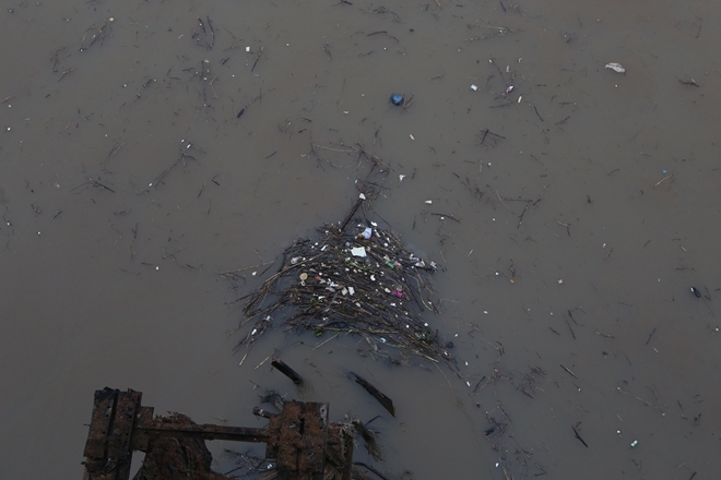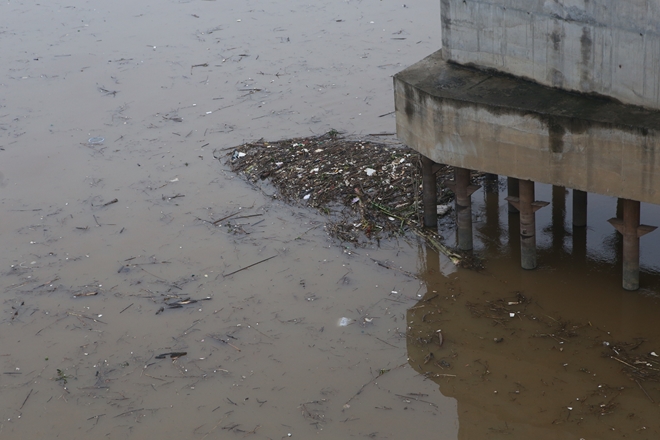 | Rác trôi nổi trên mặt sông, tầm nhìn hướng về cầu Chương Dương. |