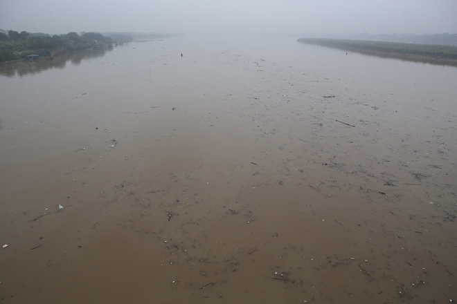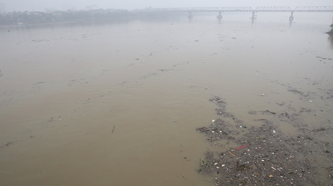 | Sông Hồng nhìn từ phía cầu Long Biên, mặt nước gần như phủ kín rác. Rác tràn ngập kết thành đám lớn bao phủ khắp mặt nước sông Hồng. |