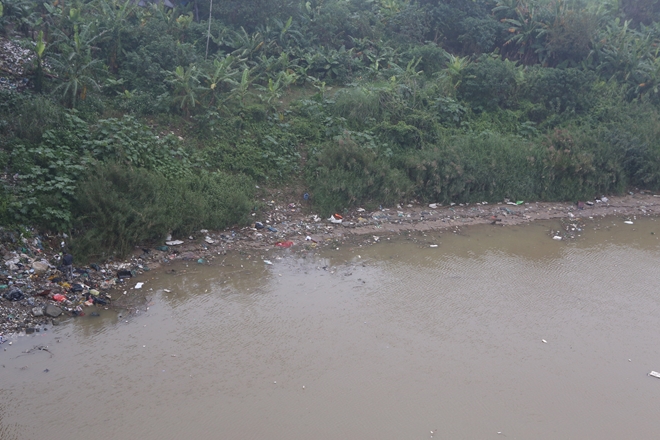 | Sát bờ sông Hồng, rác tràn ngập mặt sông. |