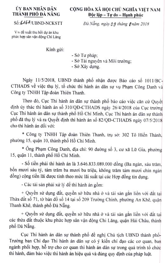 Như Báo CAND đã phản ánh, ngày 11-5, UBND TP Đà Nẵng nhận được báo cáo số 1011/BC-CTHADS về việc thụ lý, tổ chức thi hành án dân sự vụ Phạm Công Danh và Công ty TNHH Tập đoàn Thiên Thanh.
