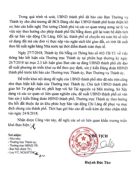 Chủ tịch UBND TP Đà Nẵng giao các sở ngành nghiên cứu, đề xuất thành phố có văn bản xin ý kiến Đảng đoàn HĐND TP, Thường trực Thành ủy theo hướng thu hồi đất thuộc dự án khu phức hợp sân Chi Lăng để phục vụ mục đích chung của thành phố. Thời hạn gửi báo cáo đề xuất kèm dự thảo chậm nhất vào ngày 24-8.
