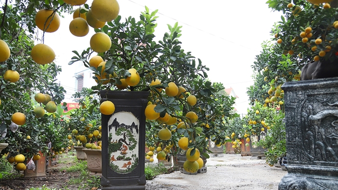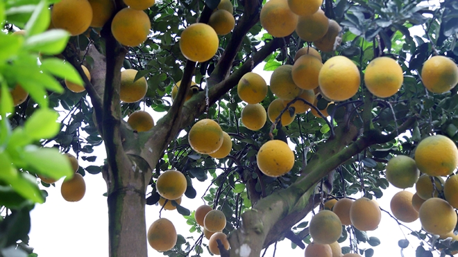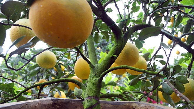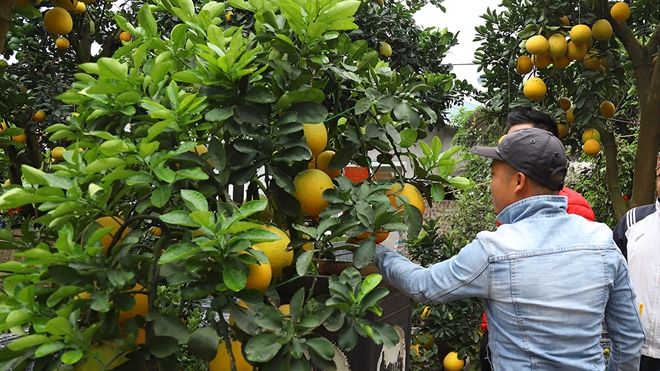| Hiện tại, nhiều người dân Thủ đô đã xuống phố hoặc về các nhà vườn để chọn bưởi cảnh chơi Tết |