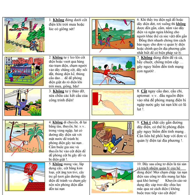 9. Nên tránh xa, cảnh báo cho mọi người xung quanh biết; lập rào chắn khi phát hiện cột điện ngã đổ, dây điện đứt rơi xuống đường, ruộng, ao hồ... và thông báo ngay cho các số điện thoại tổng đài chăm sóc khách hàng ngành Điện 24/7 (theo khu vực) để được hỗ trợ xử lý kịp thời.