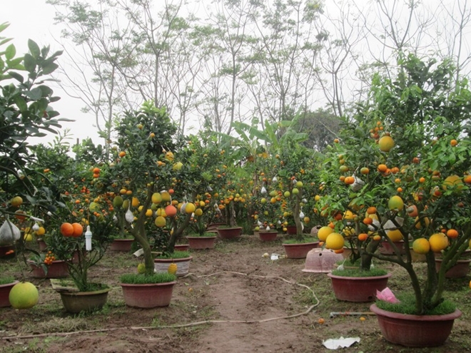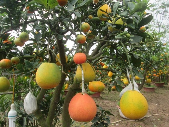 Độc đáo cây chơi Tết đã được ghép thành công 9 loại quả khác nhau trên một gốc cây. Các loại quả như: Phật thủ, quất, chanh đào, bưởi (gồm: Bưởi Diễn, bưởi da xanh, bưởi đỏ), cam (gồm: Cam Vinh, cam đường, cam sành),… tùy theo sở thích của mỗi khách hàng.