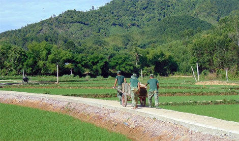 Cái nắng những ngày này tại huyện miền núi Nông Sơn, tỉnh Quảng Nam như thiêu đốt da người, trong bối cảnh đó hàng chục cán bộ chiến sĩ Kho kỹ thuật K55 - Cục kỹ thuật Quân khu V vẫn miệt mài người trộn bê tông, người kéo cát sạn phục vụ cho việc đổ bê tông làm đường chạy qua cánh đồng Hố Cái có diện tích hàng chục héc-ta để vào xóm Hố Cái thuộc thôn Trung Hạ, xã Quế Trung, huyện Nông Sơn.