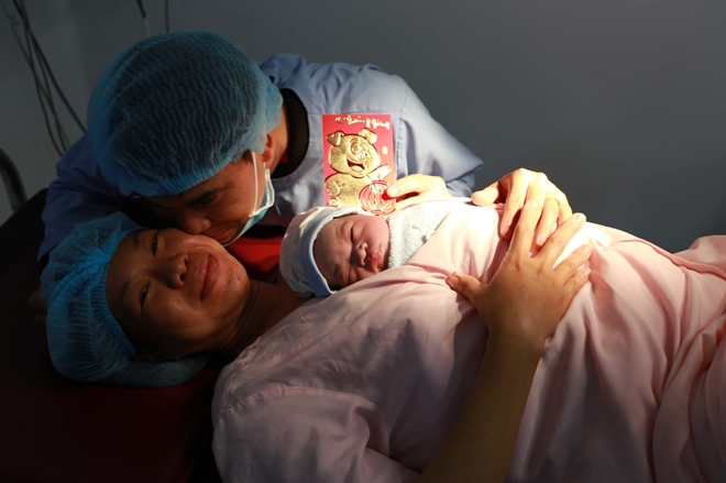 Đón con trai đầu lòng chào đời vào đúng thời khắc giao thừa, anh Lương Minh K. ôm vợ vào lòng xúc động, ánh mắt anh rạng ngời hạnh phúc khi con được da kề da và bú những giọt sữa mẹ ngọt lành đầu tiên.