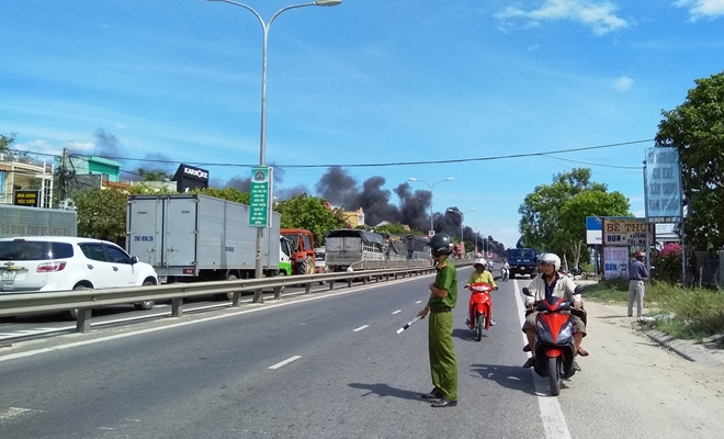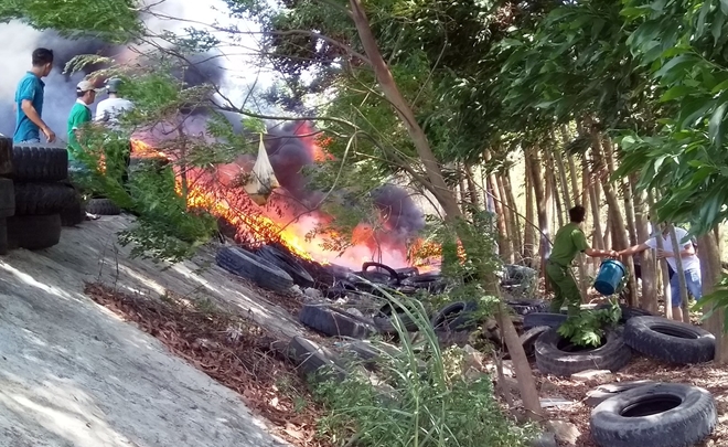 Khoảng 13h30 ngày 19-8, đống lốp xe cũ được tập kết sát QL1A đoạn qua địa bàn thị trấn Nam Phước, huyện Duy Xuyên, tỉnh Quảng Nam bất ngờ bốc cháy dữ dội.