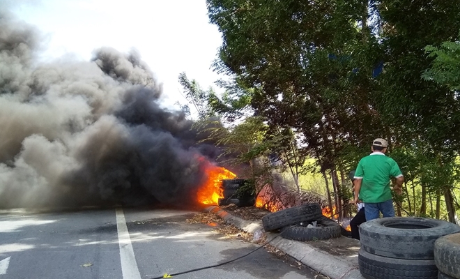 Đống lốp xe cũ bốc cháy, khói đen bủa vây cây xăng bên đường
