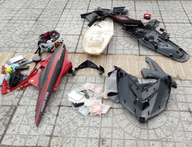 | Sau khi phá xe, vợ chồng chủ xe còn vất giấy tờ, đồ đạc tại hiện trường. |