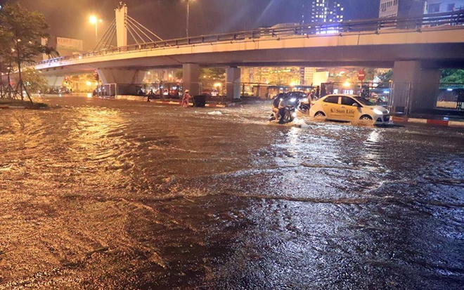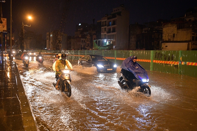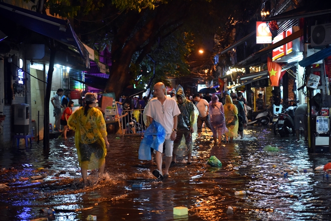 Cơn mưa lớn vào lúc nửa đêm ngày 29-4 khiến nhiều tuyến đường trong vào ngoại thành bị ngập úng nặng, người dân phải bì bõm lội đi chơi lễ. Ô tô, xe máy chết máy hàng loạt, rác nổi lềnh bềnh nơi phố cổ.T