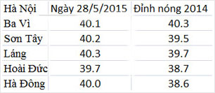 Hà Nội do tập trung nhiều nhà cao tầng, mật độ cây xanh thấp nên trở thành tâm điểm của nắng nóng. Trừ huyện Hoài Đức xấp xỉ 40 độ C, bốn điểm đo Ba Vì, Sơn Tây, Láng, Hà Đông đều bằng hoặc trên 40 độ C, trong đó trung tâm thủ đô 40,3 độ C.