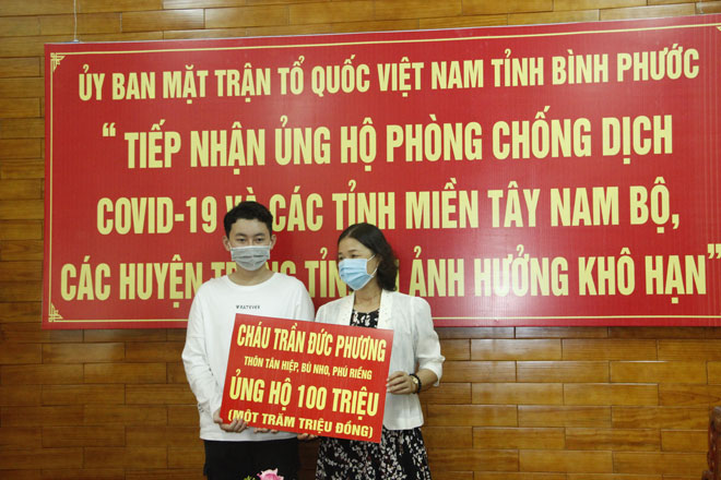 Ngày 1/4, 2 em Trần Đức Phương và em Bùi Lê Thảo Vy, cùng SN 2005, cùng học lớp 9,ở thôn Tân Hiệp, xã Bù Nho, huyện Phú Riềng đã dẫn hai đứa con đến Ủy ban MTTQ Việt Nam tỉnh ủng hộ số tiền 200 triệu đồng nhằm hưởng ứng lời kêu gọi “Toàn dân tham gia phòng chống dịch COVID-19 và các tỉnh miền Tây Nam bộ, các huyện trong tỉnh bị ảnh hưởng khô hạn” do MTTQ phát động.