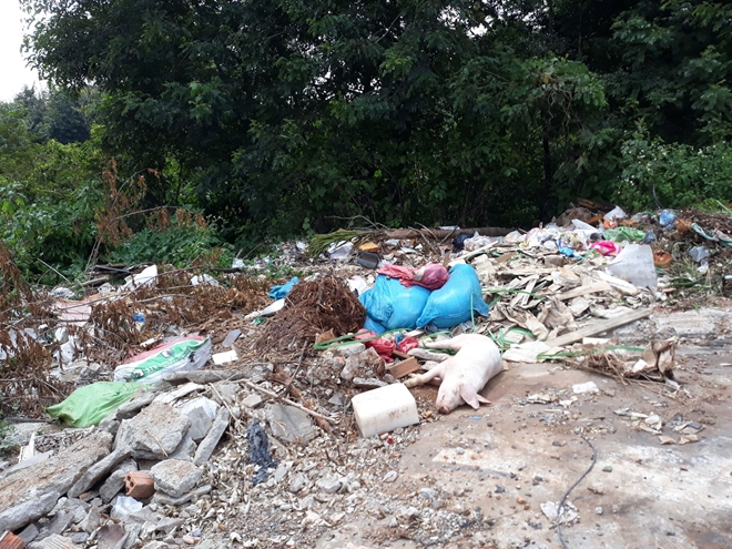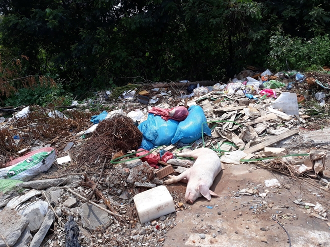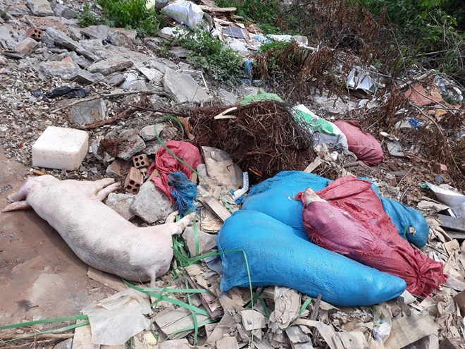 | Hàng chục con lợn chết được vứt bừa bãi dọc tuyến đường |