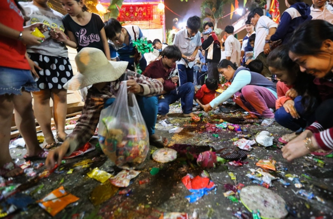 Khi đồ cúng bái đã rơi xuống sân đình, họ tranh nhau nhặt từng cái bánh, gói mì tôm đến những viên kẹo nhỏ.