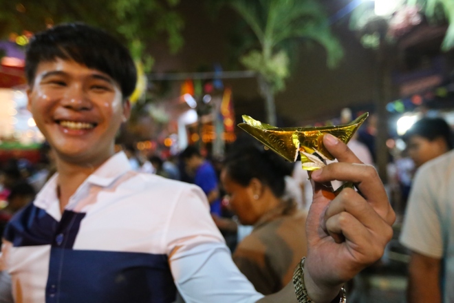 Nam thanh niên 20 tuổi nhặt được thỏi vàng giấy đã bị rách. "Vàng bị hư hỏng nhưng em vẫn thích vì lộc này ý nghĩa lắm. Có mấy người hỏi xin nhưng em không cho được", chàng trai cho biết.