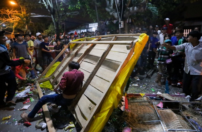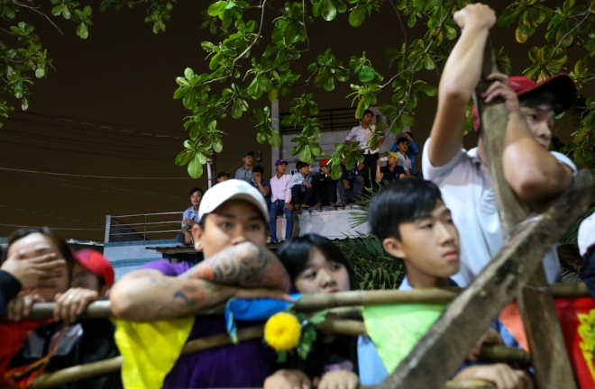 | Gần đến giờ đốt ông Tiêu, đám đông liên tục hò hết, tìm cách xô giàn. Lực lượng bảo vệ, dân phòng, cảnh sát liên tục phải giữ giàn khỏi đổ, dùng gậy, chích điện đe dọa những thanh niên quá khích. |