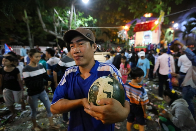Anh Minh vui vẻ khi đã giành được quả dưa hấu còn nguyên vẹn. "Trái này còn tươi và đẹp, tôi sẽ mang về để chưng. Chỉ cần lấy được chừng ấy đố cúng thôi là cũng có lộc năm mới rồi", anh Minh chia sẻ.