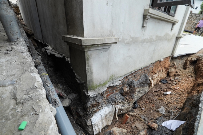 | Sụt lún khiến phần móng của ngôi nhà lộ ra ngoài. |