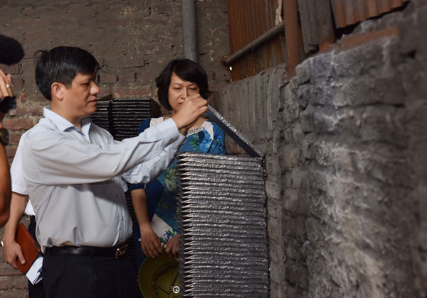 | Thứ trưởng Bộ Y tế Nguyễn Thanh Long kiểm tra tình trạng ô nhiễm chì tại xã Chỉ Đạo, huyện Văn Lâm, Hưng Yên ngày 28/5. |