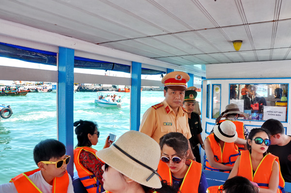 | Cán bộ – chiến sĩ Phòng CSGT đường thủy Công an tỉnh Khánh Hòa phối hợp Đồn biên phòng cửa khẩu Nha Trang kiểm tra an toàn tàu đưa đón du khách tham quan biển đảo Nha Trang. |