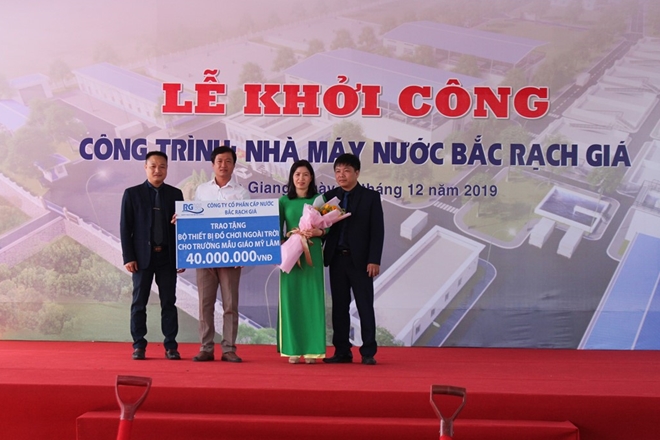 Nhân dịp này, Công ty Cổ Phần Cấp Nước Bắc Rạch Giá trao tặng bộ thiết bị chơi ngoài trời 40 triệu cho Trường mẫu giáo xã Mỹ Lâm, huyện Hòn Đất.