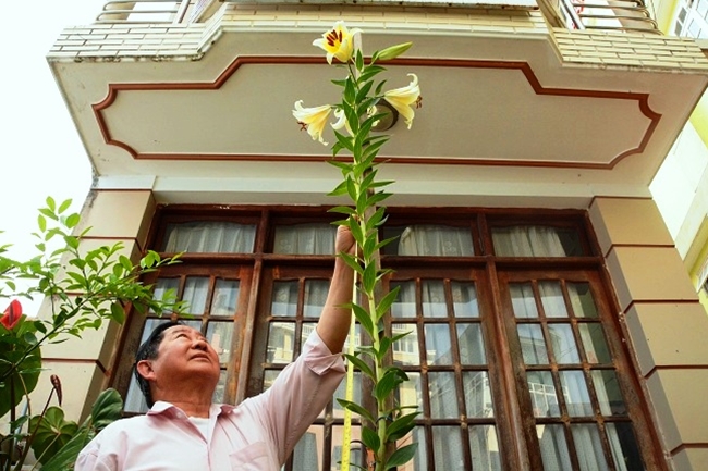 Ông Nguyễn Ngọc Quý là nghệ nhân sinh vật cảnh Lâm Đồng, có hơn 50 năm chơi cây cảnh và hoa. “ Đây là lần đầu tôi thấy cây lily cao kỳ lạ đến vậy!...” - Ông Quý cho biết.