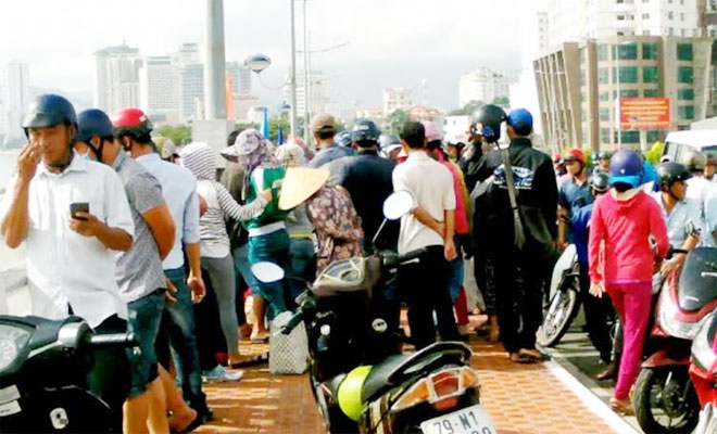 | Nhiều người dân hiếu kỳ đứng trên cầu Trần Phú theo dõi cuộc tìm kiếm nạn nhân. |