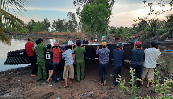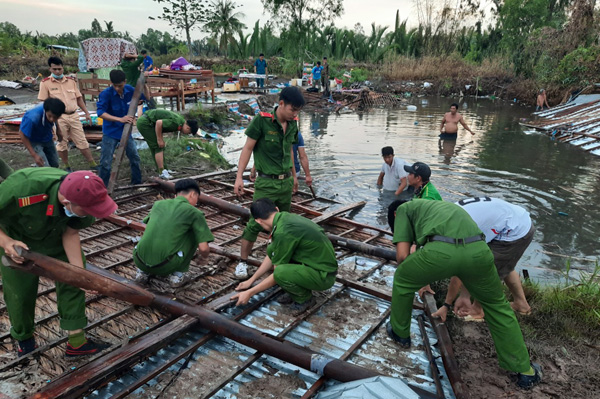 Sau khi cơn lốc đi qua, Công an huyện An Minh đã điều động 30 cán bộ chiến sỹ phối hợp cùng lực lượng của địa phương nhanh chóng đến hiện trường giúp dân khắc phục hậu quả.