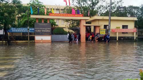 | Tuyến đường trước mặt trường THPT Cao Thắng ngập nặng... thành sông. |