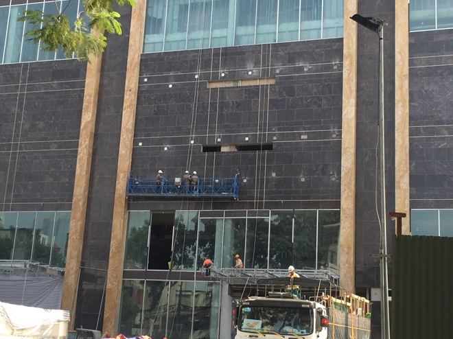 Trưa 6-7, đi qua công trường xây dựng tòa nhà cao tầng trên ở đường Hoàng Hoa Thám, hàng trăm công nhân đang hoàn thiện công trình. Mấy ngày nay họ chủ yếu hoàn thiện các căn hộ trong nhà, phía ngoài như sơn, lắp kính thì làm lúc sáng sớm hoặc chiều. Vào giờ trưa nắng nóng lên tới đỉnh điểm, công nhân hầu như không phải phơi mình hứng nắng ở bên ngoài các tầng cao.