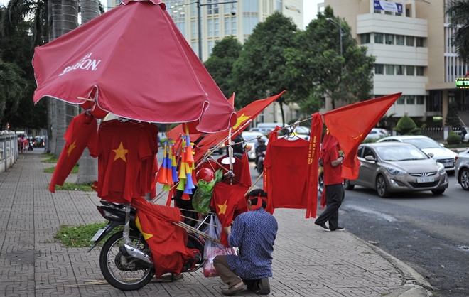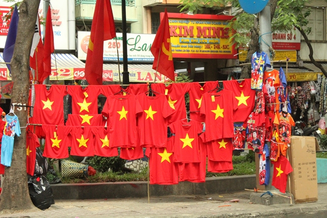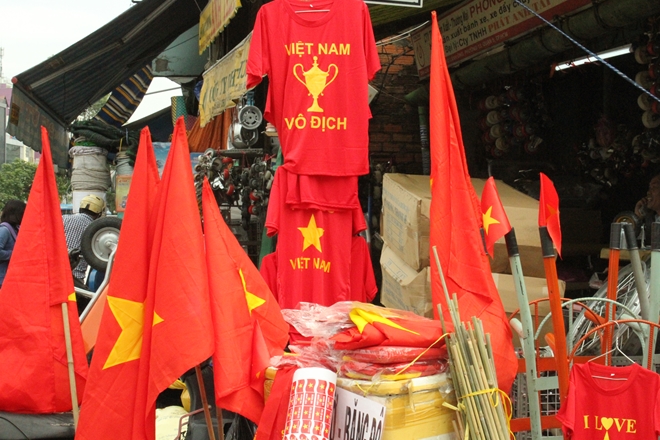 Nhiều tuyến phố băng rôn, cờ Tổ quốc được bày bán phục vụ cổ vũ cho người hâm mộ