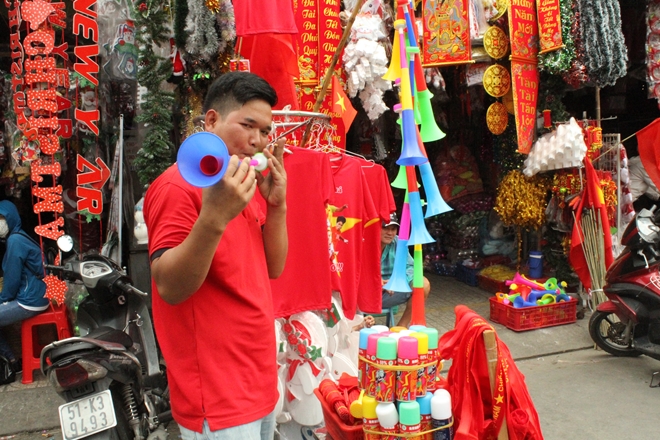 Một CĐV đang tranh thủ mua cho mình chiếc kèn để chuẩn bị cho tối nay cổ vũ bóng đá.