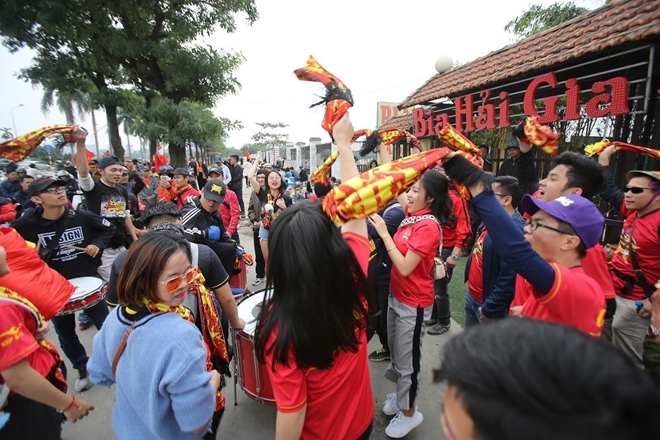 Không khí chờ đón trận bán kết đang nóng lên bên ngoài Sân vận động Quốc gia Mỹ Đình (Hà Nội) cờ trống nhiệt tình cổ vũ trước thềm thi đâú để cổ vũ cho đội tuyển Việt Nam