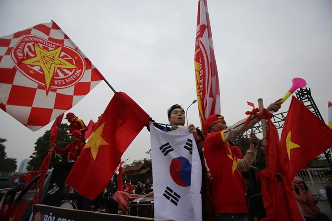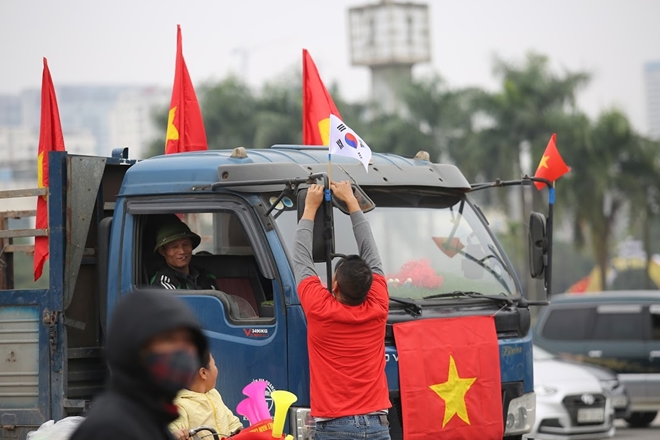 Việc trang trí cổ vũ đội tuyển Việt Nam có thể được bắt gặp ở bất cứ nơi đâu. Một CĐV đang tranh thủ trang trí cờ Việt Nam cùng với lá quốc kỳ Hàn Quốc như muốn bày tỏ sự cảm ơn giành cho HLV Park Hang-seo.