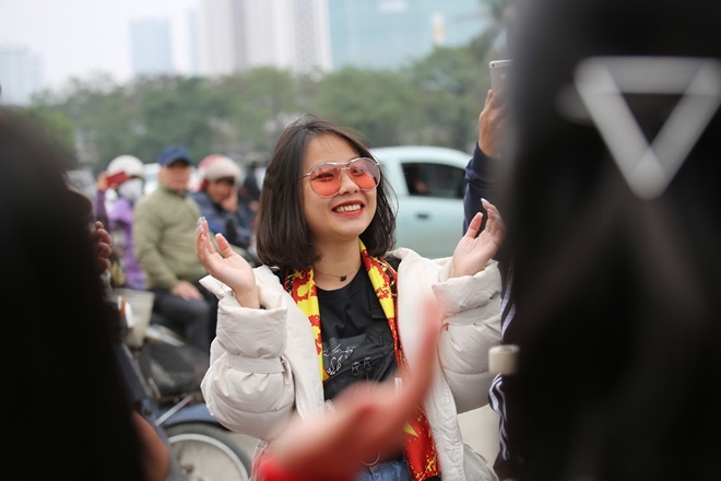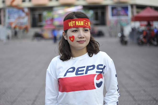 Một nữ CĐV xinh đẹp khoe sắc bên ngoài sân Mỹ Đình.