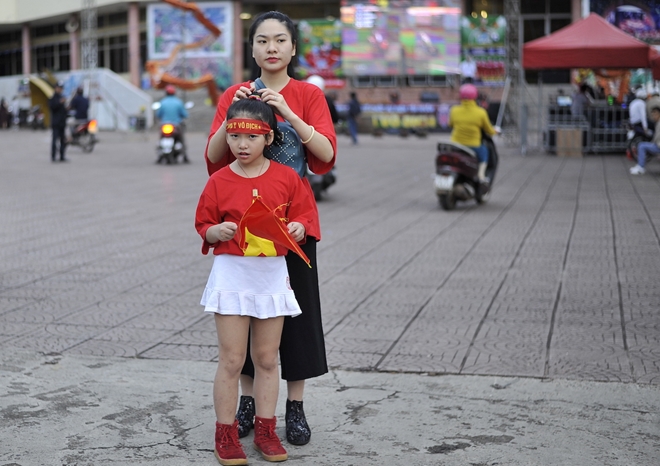 Một CĐV đưa theo con nhỏ tới sân Mỹ Đình, anh chọn cho mình cách thể hiện tình yêu với đội tuyển bằng chiếc MBH cùng chi chít cờ Tổ quốc trên đầu.