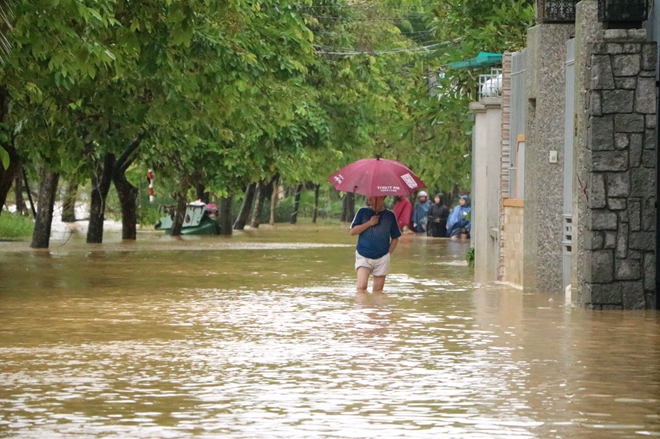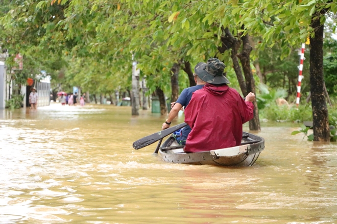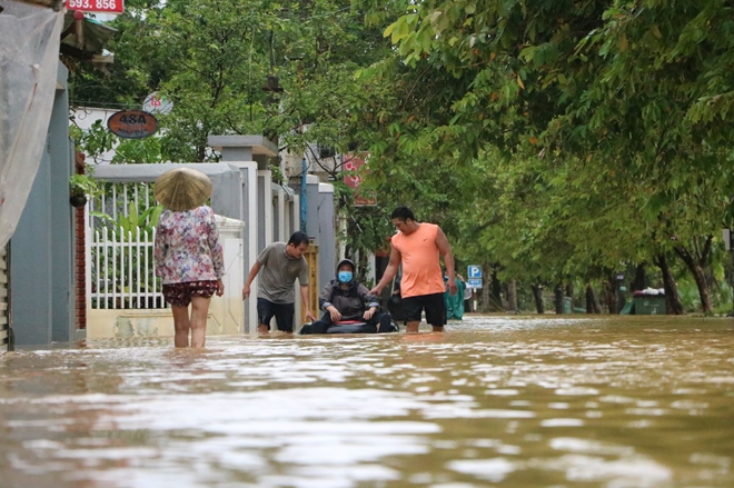Nước sông Hương dâng cao khiến nhiều tuyến đường ở trung tâm TP Huế ngập nặng; người dân phải dùng ghe, thuyền đi lại; nhiều phương tiện xe máy chạy qua các tuyến đường ngập sâu bị chết máy.