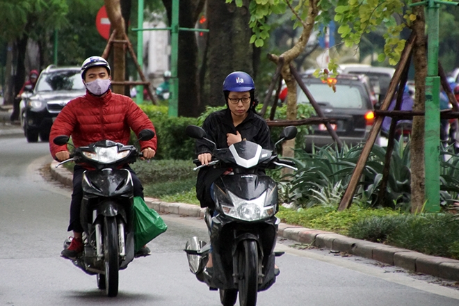 Từ sáng sớm, những người đi xe máy ngoài đường có thể cảm nhận rõ cái lạnh nhất từ đầu mùa.
